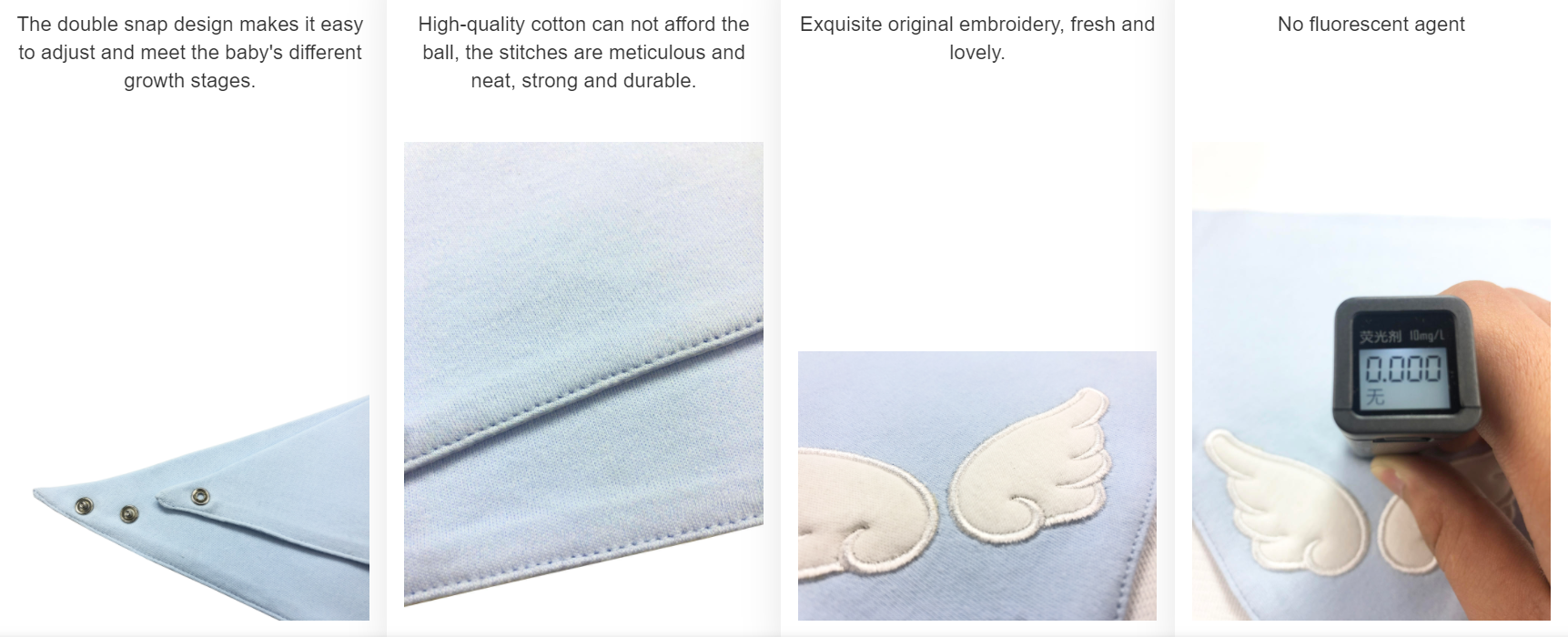 When baby is 4 or 5 month old, the salivary glands are stimulated by food and so on. When the saliva increases to teeth growing period, the small teeth hold out against the gums, leading to an increase in saliva reflexology. In addition, when eating hands and playing, lots of saliva comes out, this is a normal physiological phenomenon, but because saliva is acidic, and contains some digestive enzymes and other substances, long-term contact with the skin, will lead to skin discomfort, wear our baby bibs to undertake saliva and soup while avoid irritating skin.